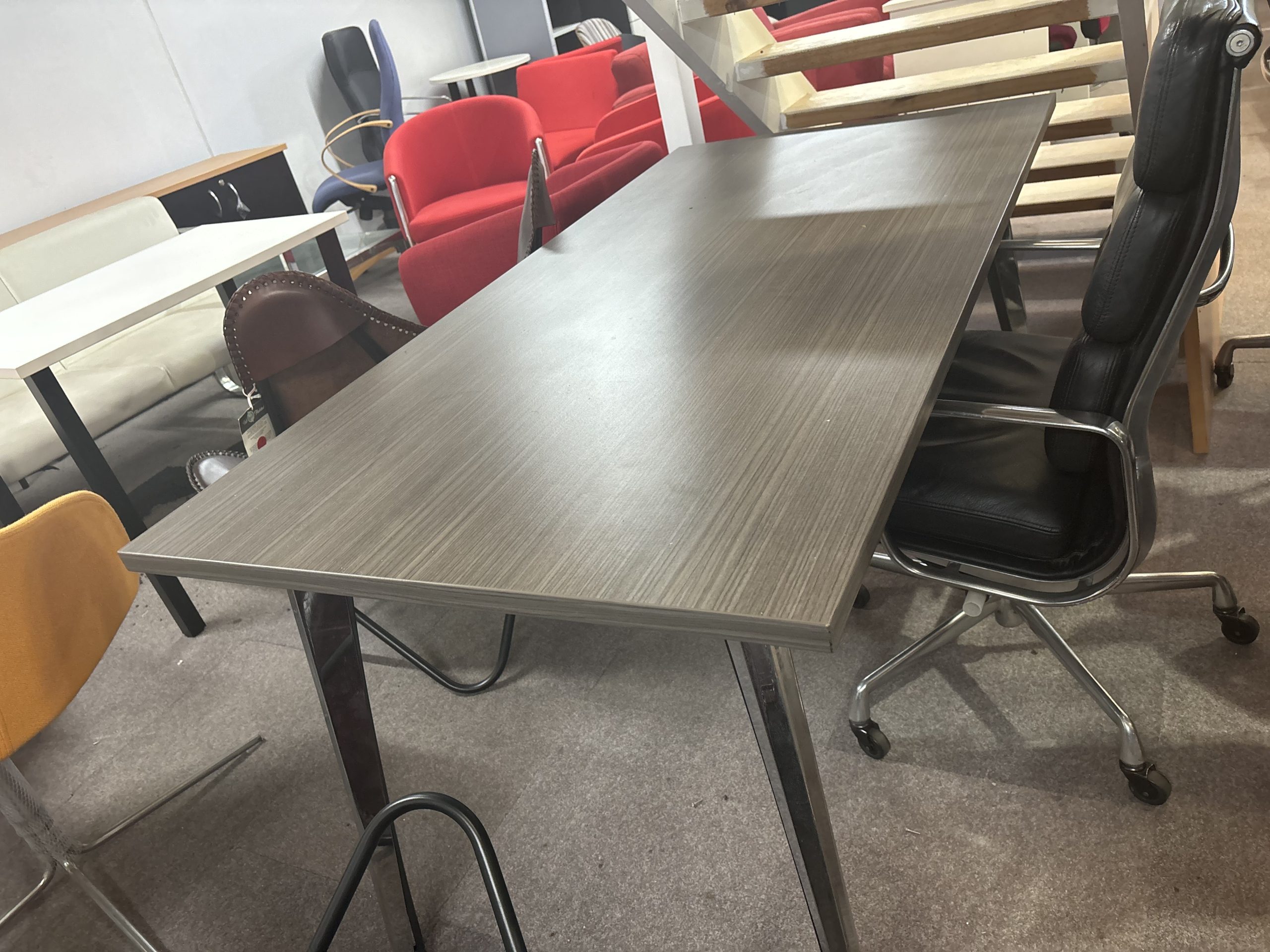 - 1500 x 750 custom desk on a chrome Arrow frame. The desktop is an Australian made Laminex Elm finish.