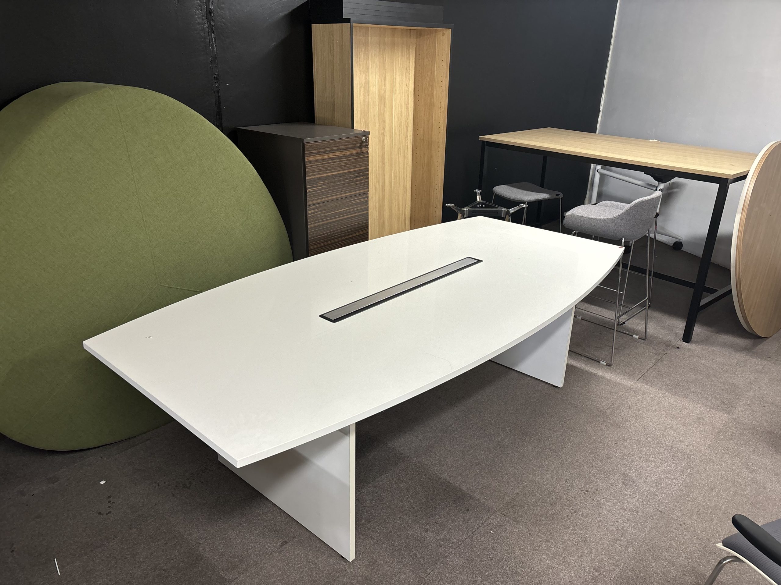 - 2400 long 1200 wide white polyurethane boardroom table white gloss finish with a built-in 1200 power box. The power box is a fuel 90 integrated power box with integrated power and data integration – –